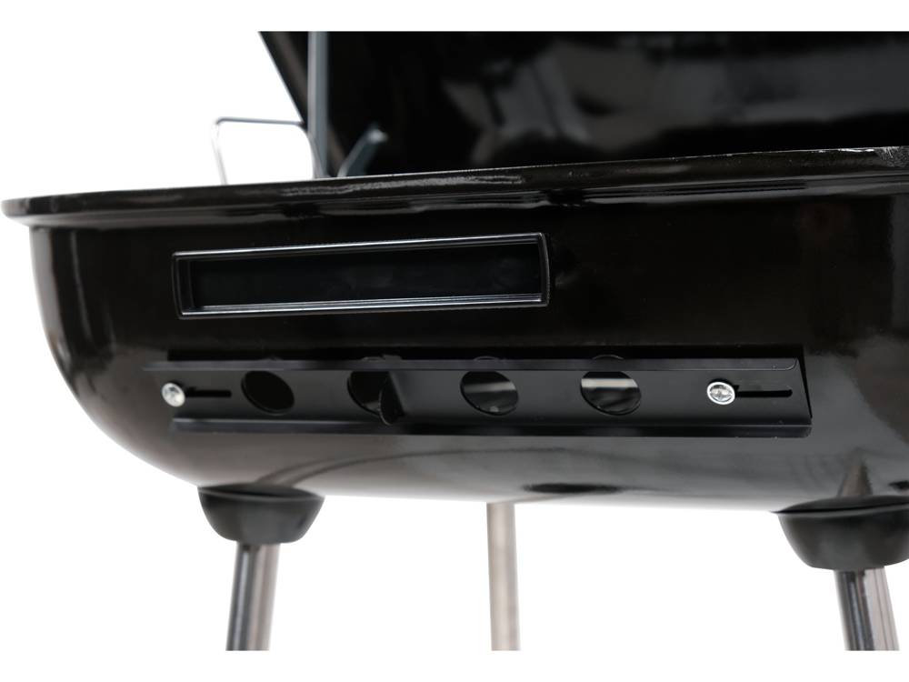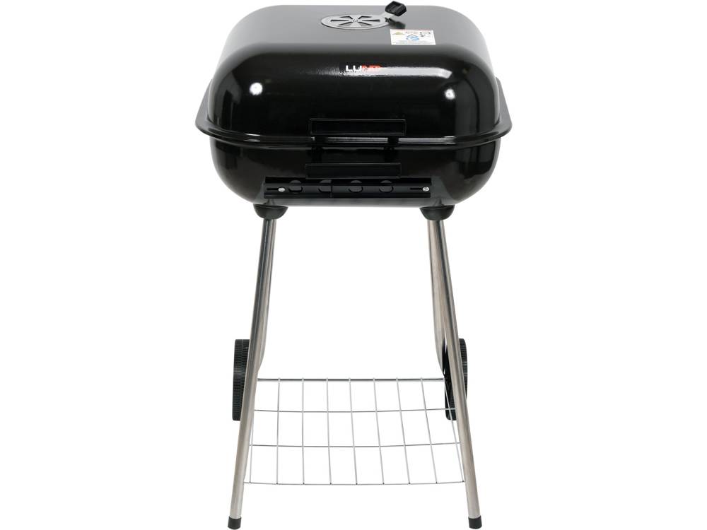 Garden grill with a rectangular lid. Chrome-plated grate, size 40x45 cm. Powder coated steel grill. Regulation of air circulation through two vents - in the lid and in the hearth. The bottom mesh shelf allows you to put away coal and accessories.