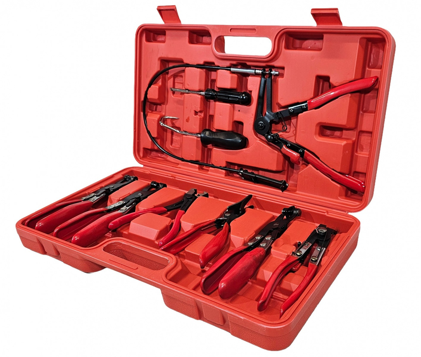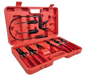 Vinyl dipped handles give additional comfort. Contents: Remote Action Hose Clip Tool, Swivel Jaw Spring Wire Clip Pliers, Swivel Jaw Band Clip Pliers, Angled Band Clip Pliers, Flat Band Clip Pliers, Clic-R Type Pliers, Hose Removal Pliers, Hose Pick, Double-Ended Screwdriver
