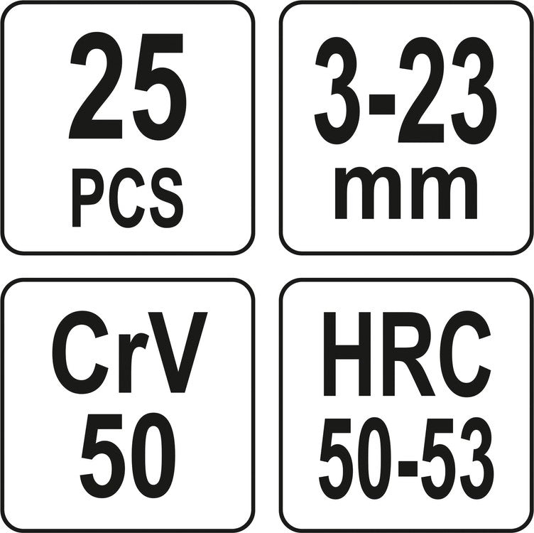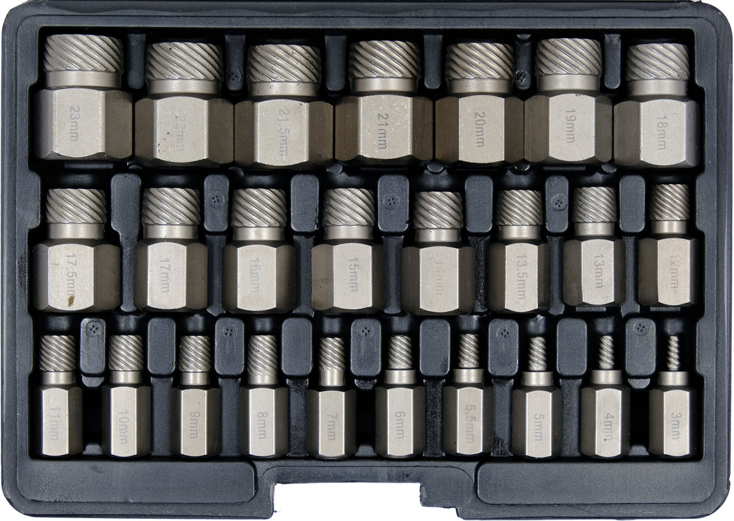 Made of high quality CRV 50 steel with a hardness of HRC 50-53. Its innovative spiral profile slides into the head of the bolt and allows it to be safely removed if it has been blocked. The complete set includes 25 extractors with a working range of 3mm to 23mm.