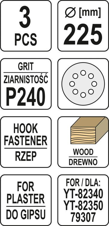 Šlifavimo popierius {velcro) apvalus | su skylėm | 225 mm / P240 | 3 vnt. (YT-83477)