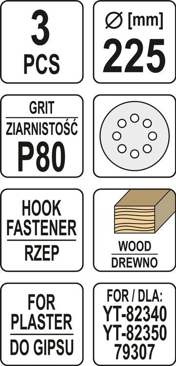 Šlifavimo popierius {velcro) apvalus | su skylėm | 225 mm / P80 | 3 vnt. (YT-83472)