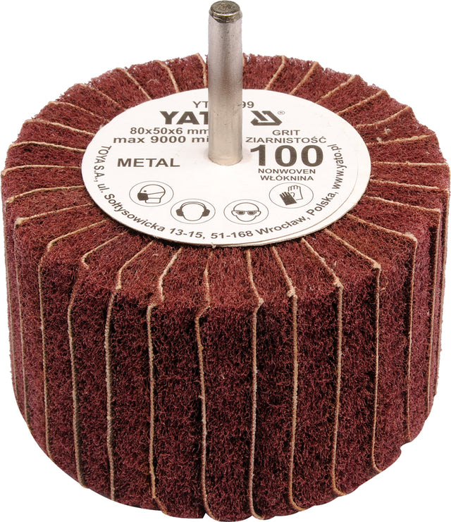 Mounted flap wheel for grinding metal, wood, plastics and other materials. A working abrasive element are leaves of abrasive cloth and polishing cloth, permanently attached to a steel mandrel. Shank flap wheels work with drills or straight grinders