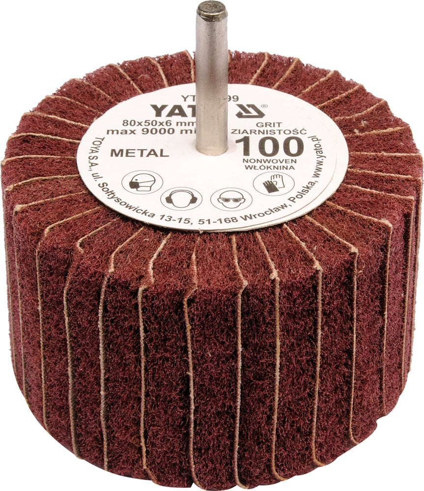 Mounted flap wheel for grinding metal, wood, plastics and other materials. A working abrasive element are leaves of abrasive cloth and polishing cloth, permanently attached to a steel mandrel. Shank flap wheels work with drills or straight grinders.