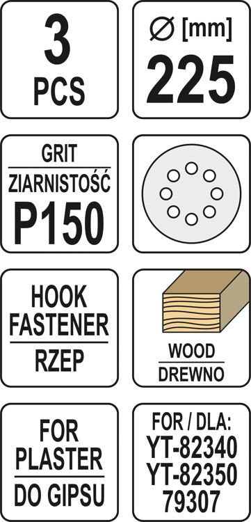Šlifavimo popierius (velcro) apvalus | su skylėm | 225 mm / P150 | 3 vnt. (YT-83475)