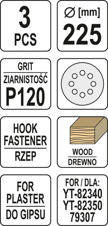 Šlifavimo popierius {velcro) apvalus | su skylėm | 225 mm / P120 | 3 vnt. (YT-83474)