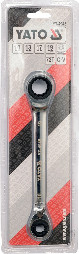 Double-sided ratchet socket wrench made of durable chrome-vanadium steel. With the double-sided key construction, four sizes: 10; 13; 17 and 19mm. Rattle has 72 teeth. Surface finished with chrome. Key has a switch to change the direction of rotation. It was developed to meet the needs of specialized services of automotive and mechanical.