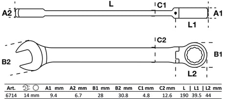 Kombinuotas raktas su terkšle | šarnyrinis | 14 mm (6714)
