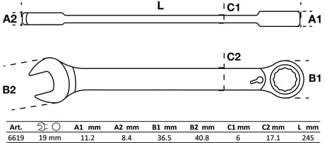 Kombinuotas raktas su terkšle | su reversu | 19 mm (6619)