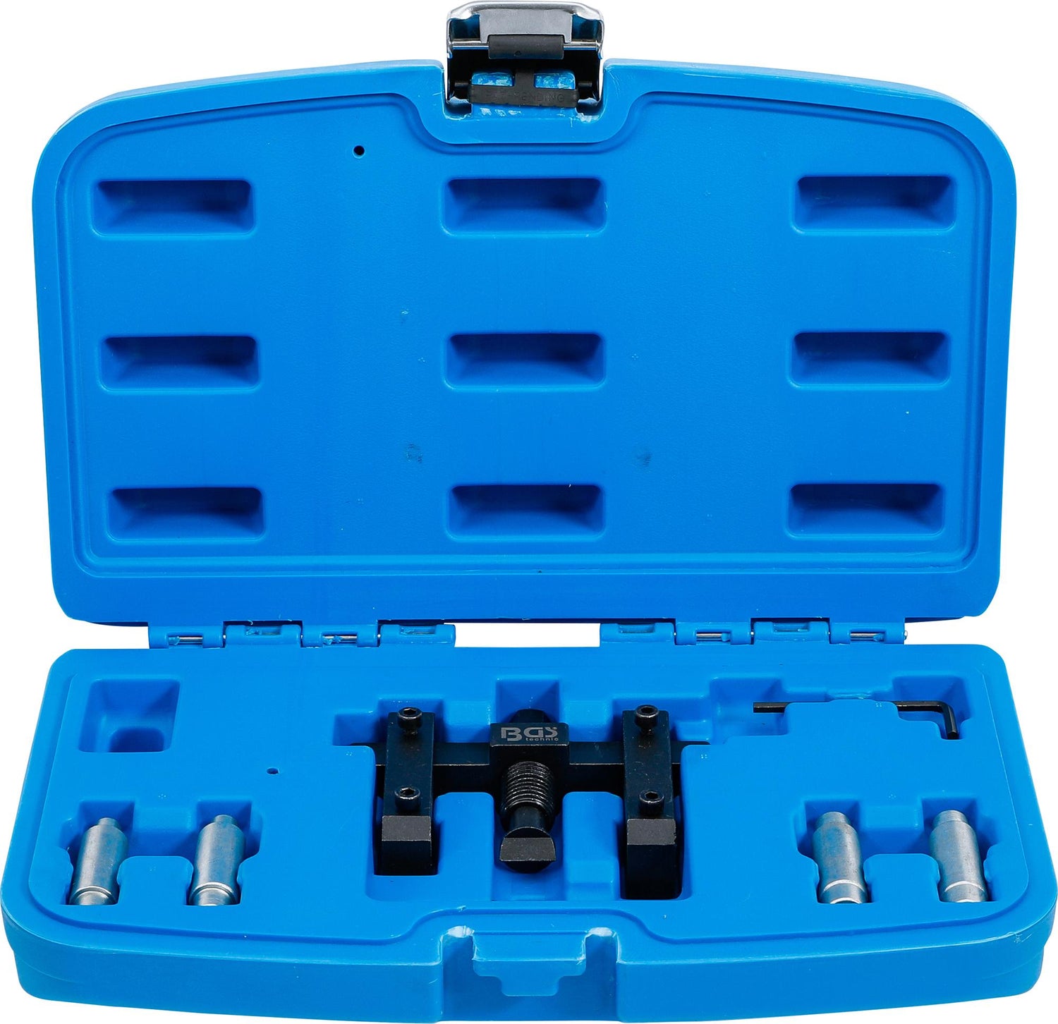 with 2 exchangeable spreading inserts (5 mm and 8 mm depth) and guide pins 8x10 mm (2x) and 10x12 mm (2x) for the shock absorber seat in the wheel bearing housing when changing the damper, for wishbone ball joint seat when disassembling the suspension strut etc.
