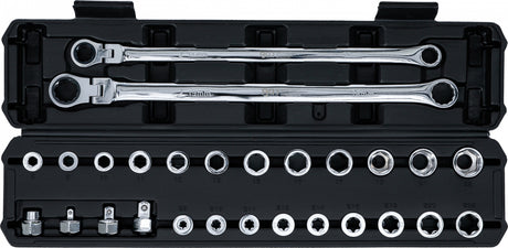 Dvigubo žiedo ir lanksčios galvutės terkšlinių veržliarakčių rinkinys | ilgi | 27 vnt. (74274)