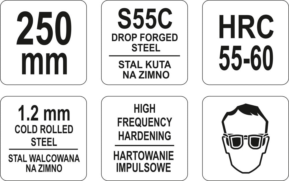 Forged, "S" type scissors made of S55 steel. Jaws hardened inductively to a hardness of about 55-60 HRC, effectively cutting sheet steel up to 1.2 mm thick / cold rolled steel. Equipped with easily disassembled spring, opening handles and jaws. This makes it easier to cut sheet metal. Handles covered with soft pads. Overall length 250 mm.