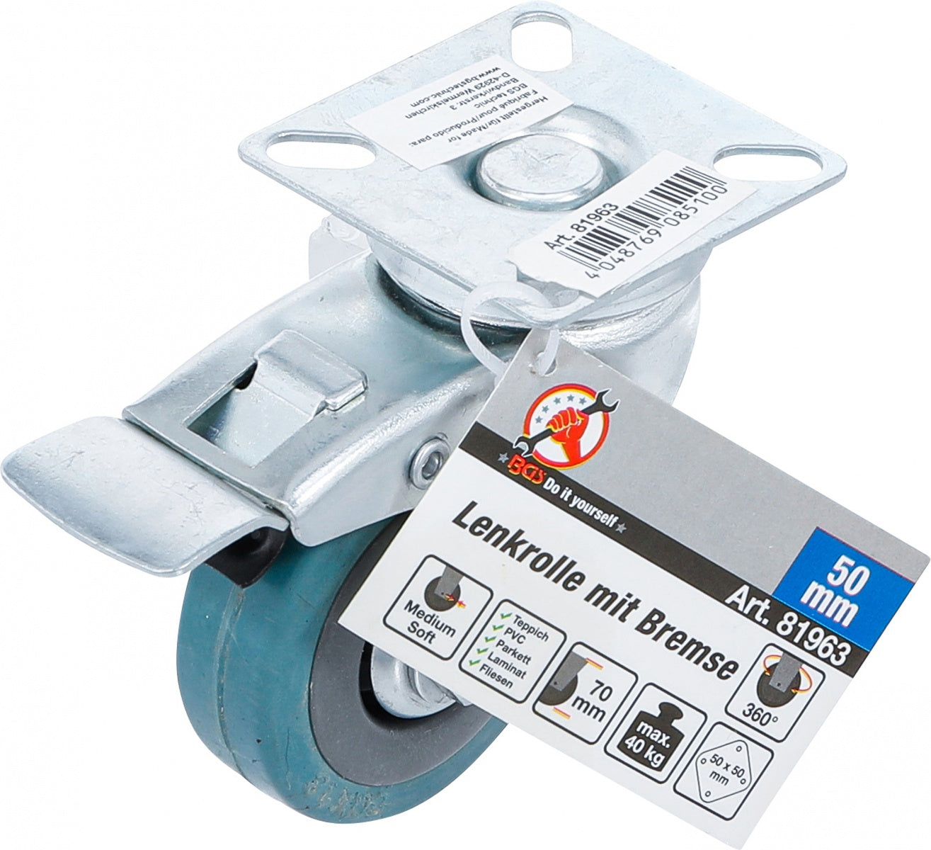 Pasukamas ratukas su stabdžiu | Guma | su montavimo plokšte | Ø 50 mm (81963) yra užsakomoji prekė, ją išsiųsime per 3-4 savaites.