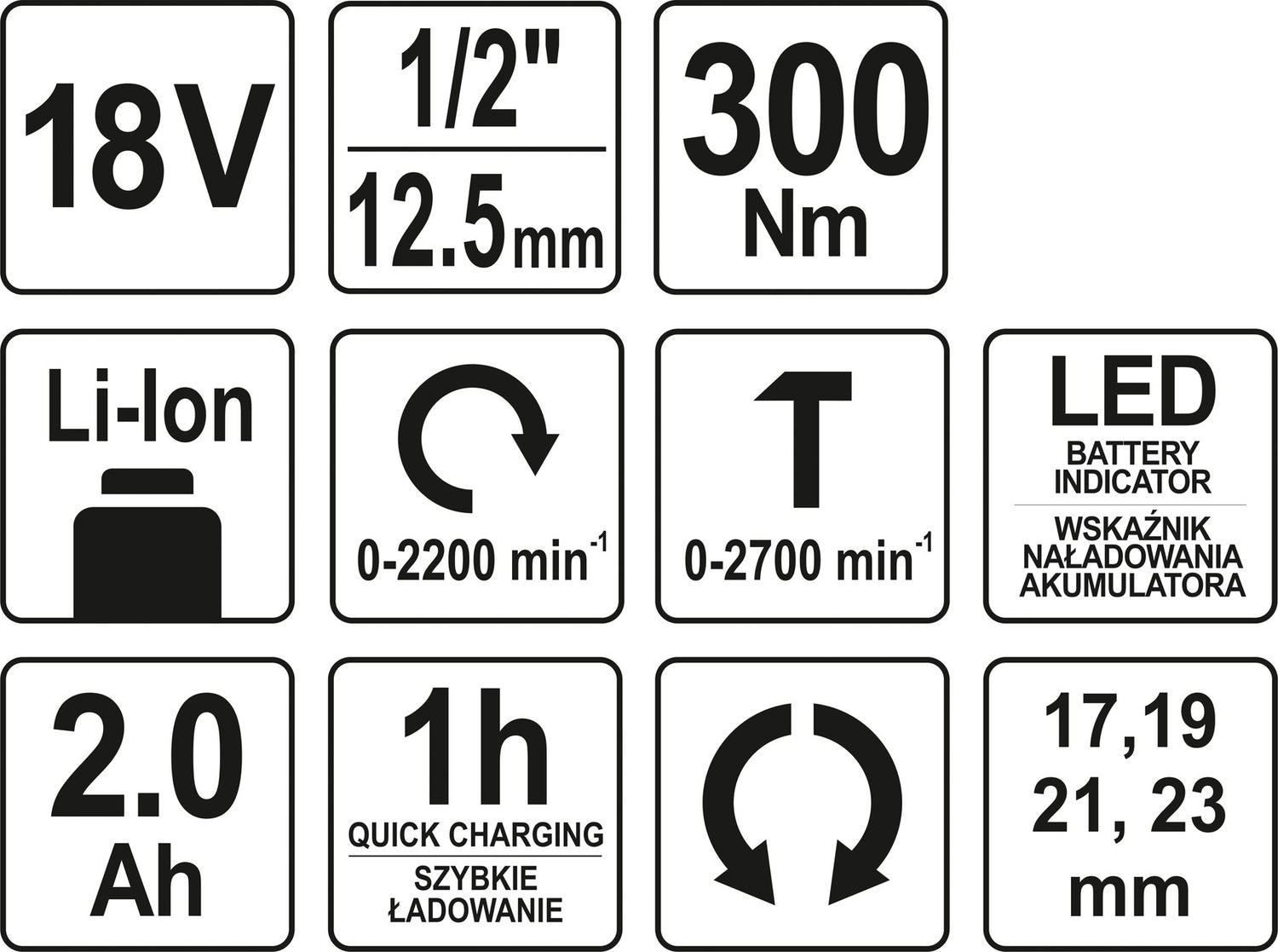 Prietaisas sukomplektuotas su 4 HEX galvutėmis, pagamintomis iš chromo vanadžio (CrV) plieno lydinio: 17mm | 19mm | 21mm | 23mm