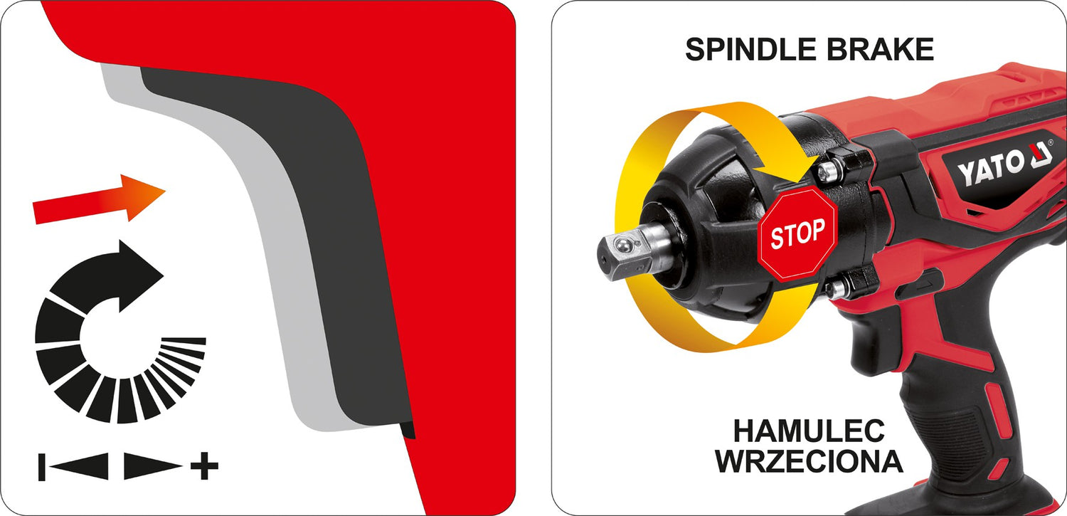 Galingas 1/2" smūginis akumuliatorinis veržliaraktis YATO YT-82804 - tai universalus nešiojamas DIY+ klasės įrankis, tinkamas darbui autoservise, dirbtuvėse ar statybose. Įrankis varomas aukščiausios klasės keturpoliu varikliu. Tikslus greičio valdymas potenciometru. Tangentinis smūgis įrankio jėgą nukreipia į veržles, o ne riešą, todėl galima atsukti veržles, priveržtas didesniu nei 300Nm sukimo momentu. Veržliaraktis tinka ratų veržlėms (iki M28 dydžio) atlaisvinti. Veleno stabdis leidžia greitai pakeisti antgalius. Įrankis turi ergonomišką rankeną. Prietaiso korpusas dengtas guma ir pagamintas iš stiklo pluoštu armuoto poliamido. Patvarus reduktorius, pagamintas iš 53-56 HRC plieno.