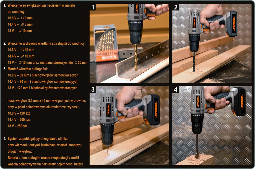 Akumuliatorinis suktuvas-gręžtuvas STHOR 78981 - tai universalus nešiojamas DIY klasės įrankis, skirtas medžio ir metalo gręžimui bei įvairių sraigtų ir varžtų sukimui. Suktuvo-gręžtuvo griebtuvo diapazonas 0.8-10mm. Nominalios apsukos: 0-700 min-1. Didžiausias gręžimo diametras medienoje - 10mm, pliene - 6mm. Suktuvas-gręžtuvas pilnai įkrautu akumuliatoriumi gali įsukti iki 120vnt. 3.5x45mm ilgio medvaržčių. Įrankis puikiai tinka įvairiems baldų surinkimo bei kitiems montavimo darbams.