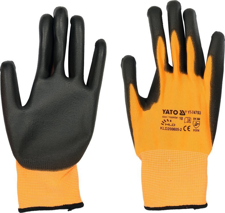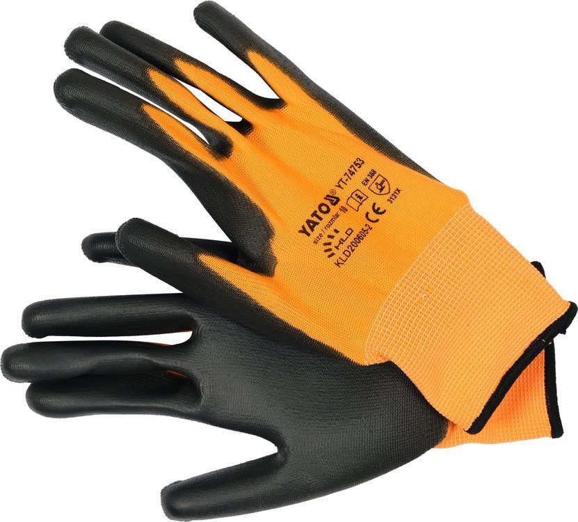 YT-74753 protective working gloves made of orange polyester, coated in the grip part with black polyurethane with a special admixture enabling smooth operation of touch screens in devices such as a smartphone or tablet.