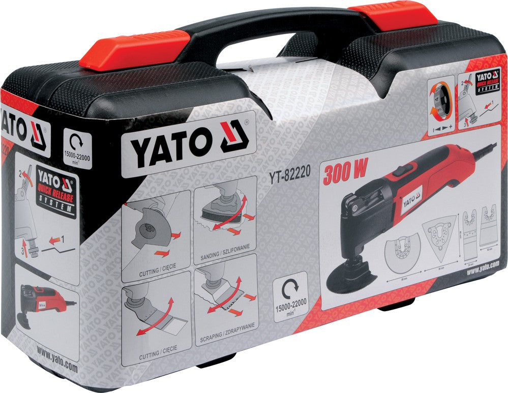 Daugiafunkcinis įrankis YATO YT-82220 komplektuojamas kartu su priedų rinkiniu ir pateikiamas tvirtame plastikiniame YATO lagamine.