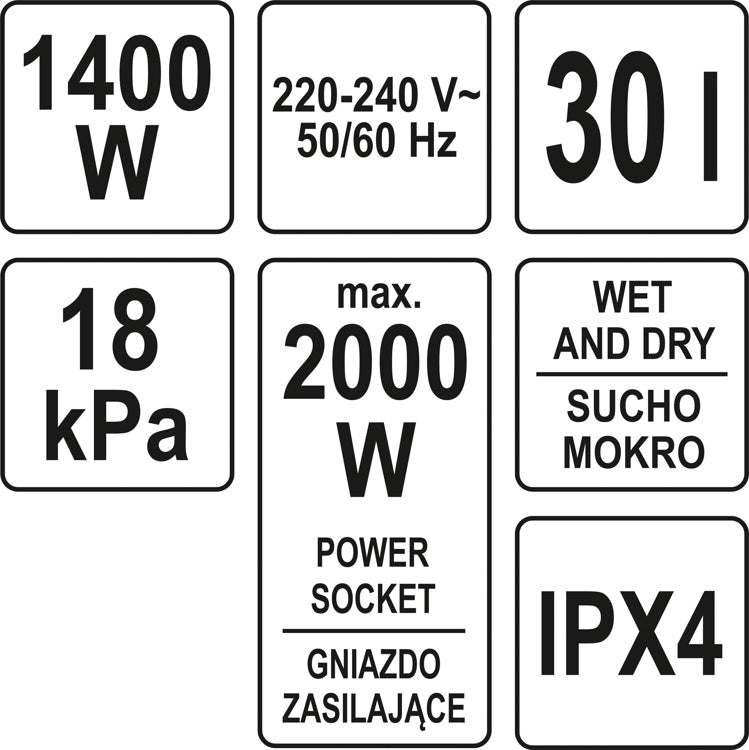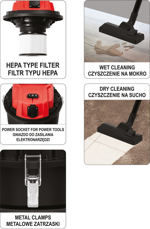 Dulkių siurblys pramoninis | drėgna ir sausa funkcija | 1400/2000 W / 30 l (YT-85701) yra užsakomoji prekė, ją išsiųsime per 3-4 savaites.