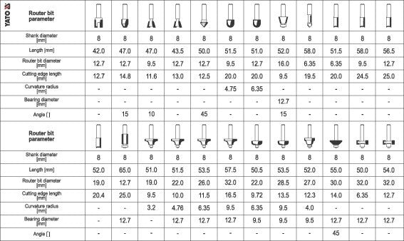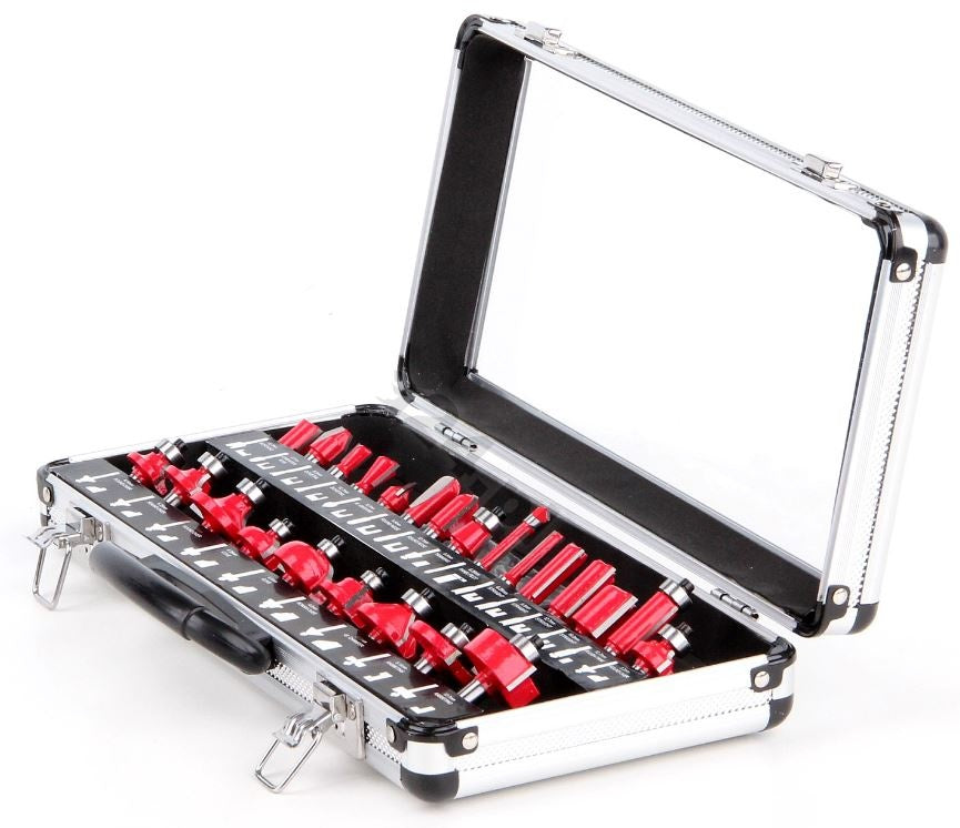 Precise, high-speed wood cutters. 8 mm fixture, equipped with profiled cutting inserts made of silicon carbide YG6X. Silver solder, tolerance of 0.08 mm. Edge milling cutters with bearings to facilitate the milling machine. A set of 25 cutters, assembled in a functional case with glass for easy control and quick selection of the right tool.
