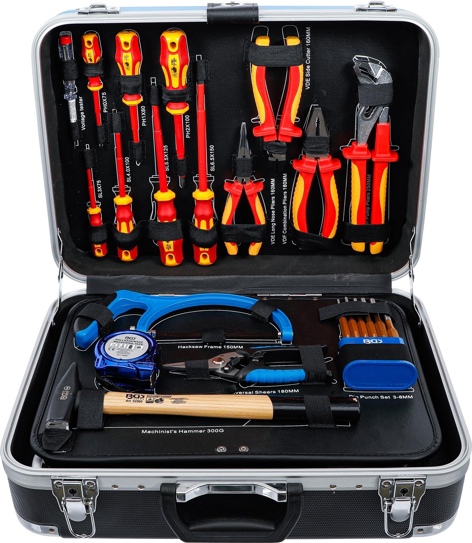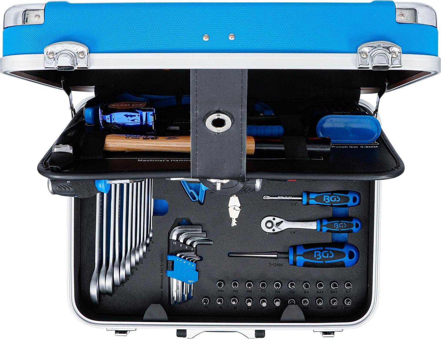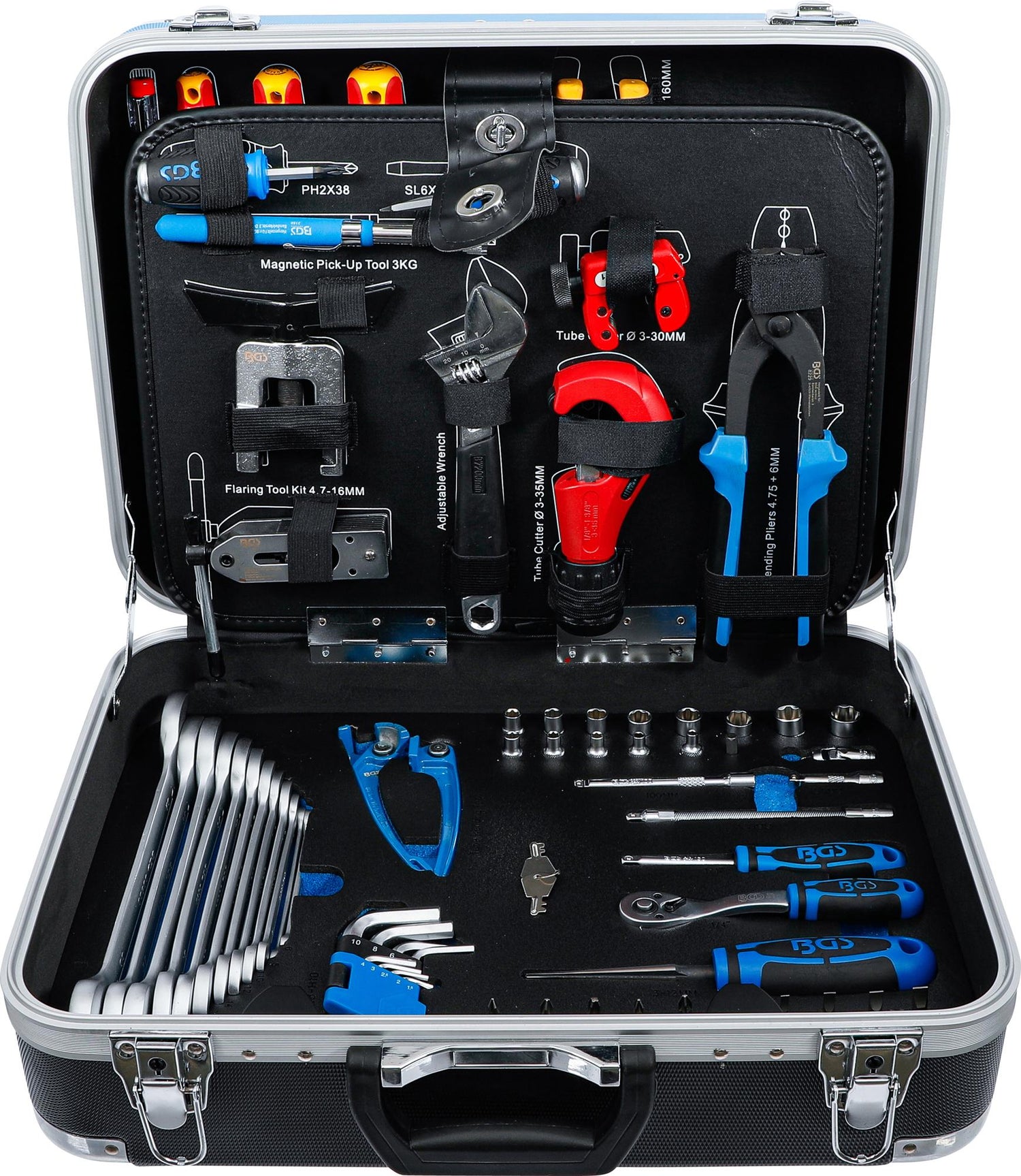 Komplekte yra 1/4" šešiakampių HEX Super Lock galvučių rinkinys, dvigubų atvirų veržliarakčių komplektas, prailgintuvai, 90 dantų reversiniai terkšliniai raktai, universalios (kardaninės) jungtys, izoliuotų VDE atsuktuvų bei replių komplektas, įpresuotų antgalių rinkinys, vamzdžių pjaustymo ir lankstymo įrankiai, matavimo įrankiai bei daugybė kitų elementų. Super Lock banguoto profilio (wawe profile) galvutės pasižymi mažesniu praslydimu, geriau priglunda ir leidžia sukimo momento jėgą nukreipti į veržlės sienelę.