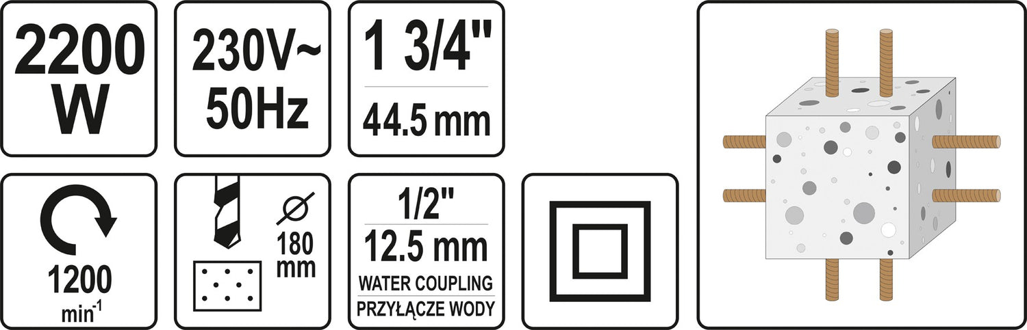 Įrenginys deimantiniam gręžimui | su aušinimu | 30 - 180 mm | 2200 W (YT-81980) yra užsakomoji prekė, ją išsiųsime per 3-4 savaites.