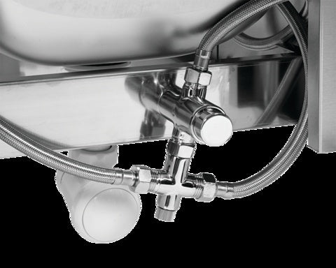 Sink, wall-mounted tap, soap dispenser, mixer valve, timed opening valve, flexible hoses