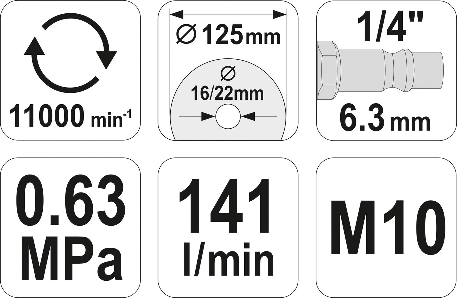 WITH SAFETY TRIGGER, SPINDLE SIZE 22MM OR 16MM, M10x1,5, FREE SPEED 11000RPM, GRINGING WHELL 125MM OR 5", AIR INLET 1/4", AIR HOSE 3/8", AIR CONSUMPTION 141L/MIN, WORKING PRESSURE 6,3BAR, LENGTH 225MM, HEIGHT 140MM, WEIGHT 1,67KG; BLACK- HAMMER TONE FINISHING