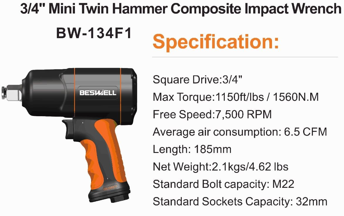 Pneumatinis smūginis veržliaraktis Beswell 134F1 - tai universalus DIY klasės įrankis, tinkamas darbui autoservise, dirbtuvėse ar statybose. Prietaiso korpusas, pagamintas iš kompozicinio lydinio, pasižymi dideliu patvarumu. Twin Hammer sistema reiškia, kad du daužikliai per vieną apsisukimą suduoda vieną smūgį. Toks veržliaraktis yra patvariausias iš visų žinomų konstrukcijų, tvirtesnis, mažiau vibruoja bei išgauna galingą smūgį. Beswell BW-134F1 puikiai tinka naudoti keičiant padangas ar atliekant kitus surinkimo darbus, dideliems varžtiniams sujungimams ant lengvųjų automobilių, mikroautobusų ir komercinių transporto priemonių ašių ar kėbulo.
