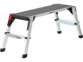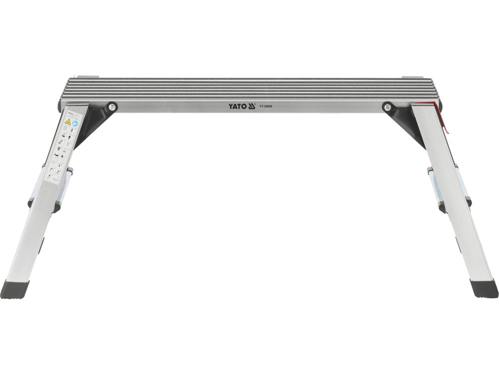 Foldable work platform made of aluminum profiles. For safety of use, the platform is covered with anti-slip strips, and the steps are embossed. Large locking locks ensure easy unfolding.