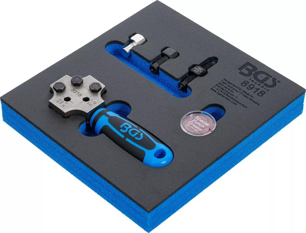 Stabdžių vamzdelių valcavimo (plėtimo) įrankių komplektas BGS Technic 8918 skirtas lengvai ir greitai atlikti 4.75 mm (3/16") stabdžių vamzdelių jungimą flanšinių jungčių pagalba pagal SAE (Society of Automotive Engineers) ir DIN (Deutsches Institut für Normung) reikalavimus. Šio įrankio pagalba galima atlikti viengubų arba dvigubų flanšinių jungčių formavimą (tik pagal SAE); tinkamas ir sumontuotiems stabdžių vamzdeliams. Įrankis naudojamas su 10 mm ir 17 mm veržliarakčiais.
