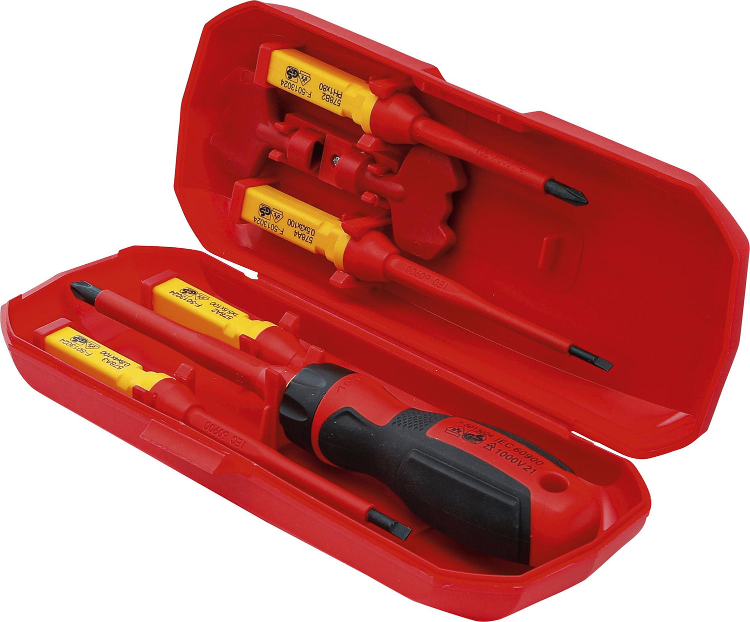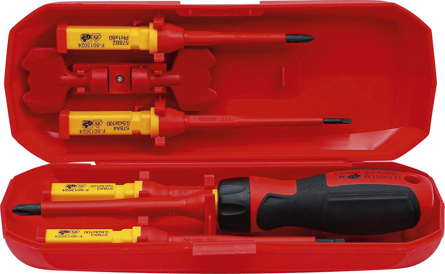 1 x dviejų dalių izoliuota atsuktuvo rankena su fiksuojamu automatiniu geležčių laikikliu | 1000V | DIN EN 60 900:2012 | VDE