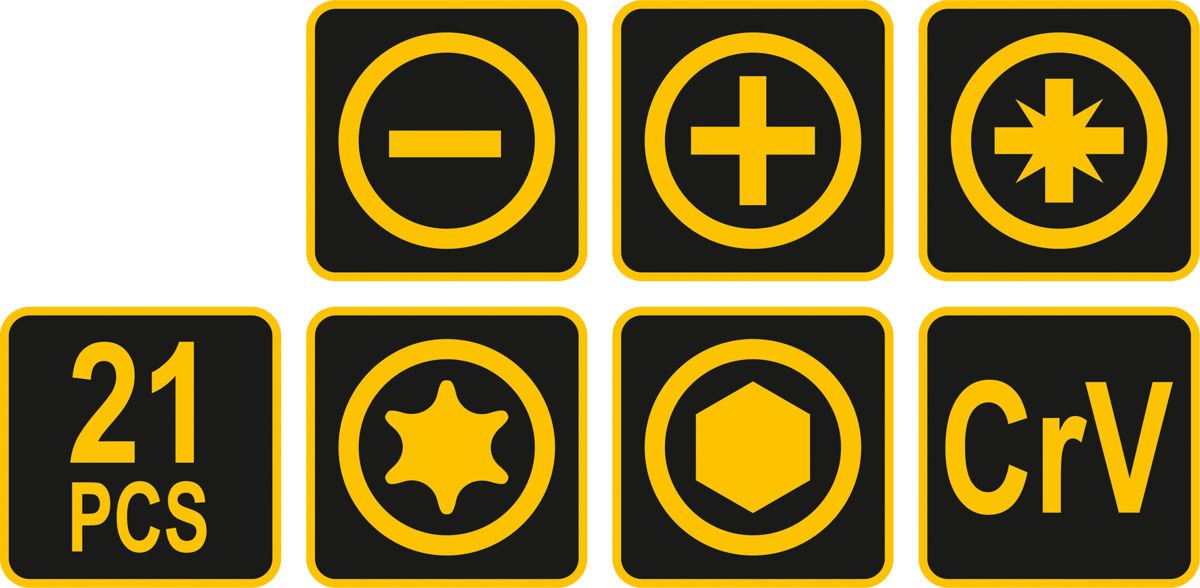 Адаптер и 20 бит в комплекте: TORX T10, T15, T20, T25, T27, T30, PH1, PH2, PH3, PZ1, PZ2, PZ3, 4, 5, 6, 7 мм (плоские), HEX 3, 4, 5 , 6 мм