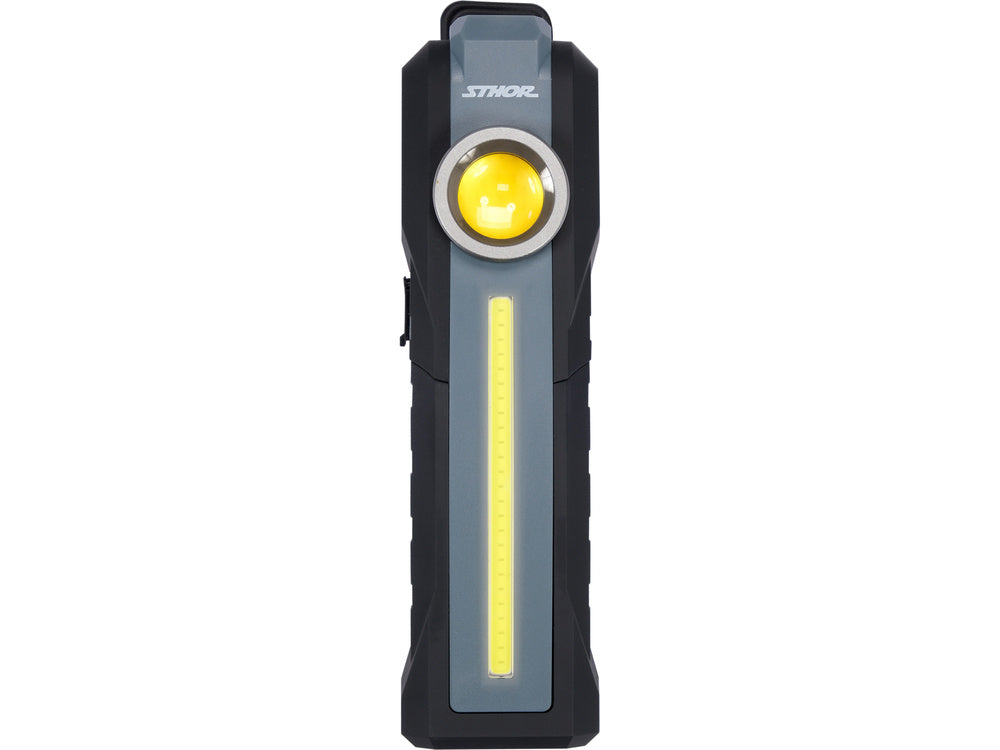 Рабочий фонарь с тремя источниками света. Может быть подвешен на крючок или зажим. В основании есть магнит. Угол освещения можно регулировать благодаря складной конструкции. Работает в последовательности: мощный светодиодный фонарь - круговой COB-диод - длинный COB-диод.